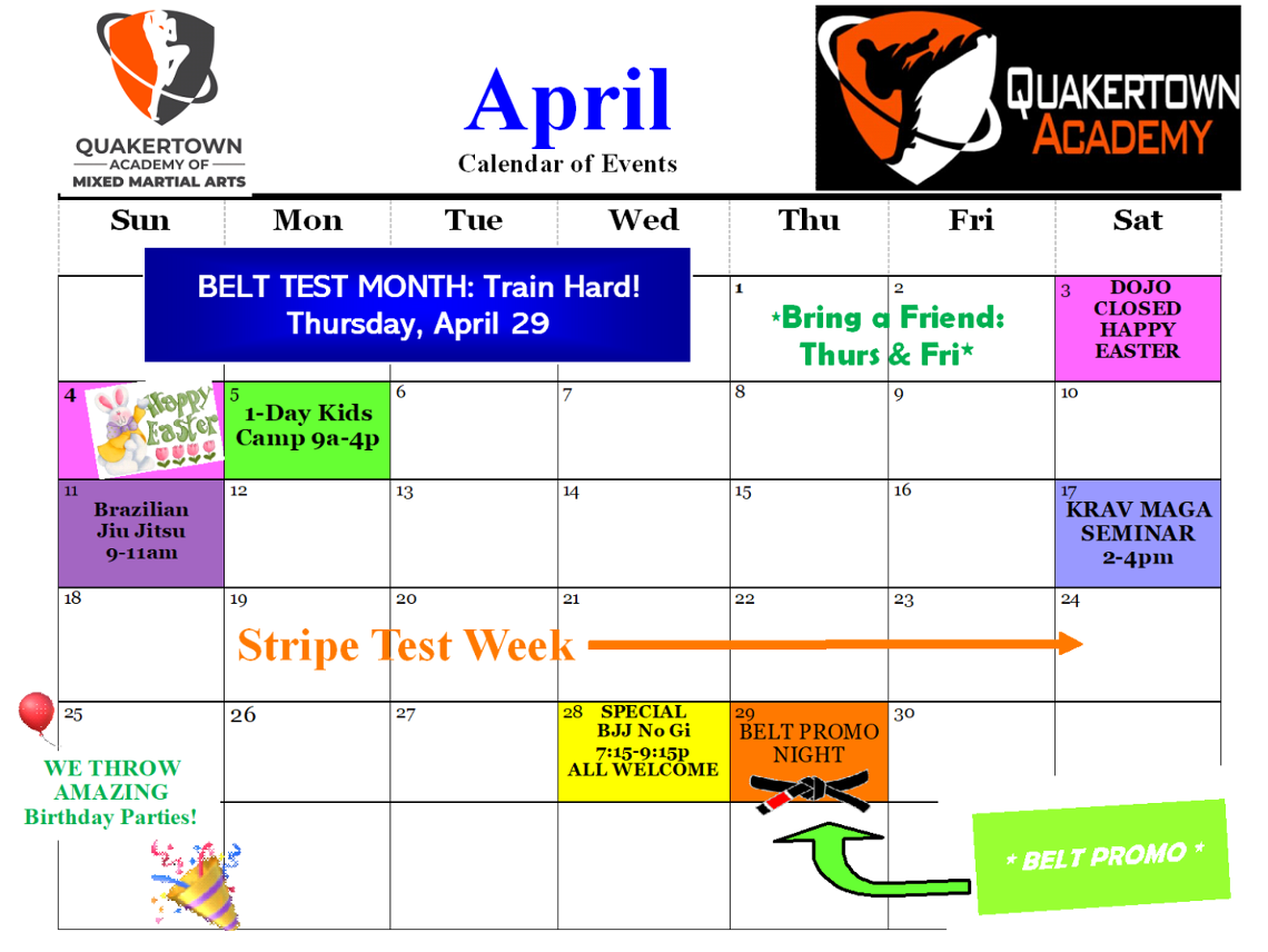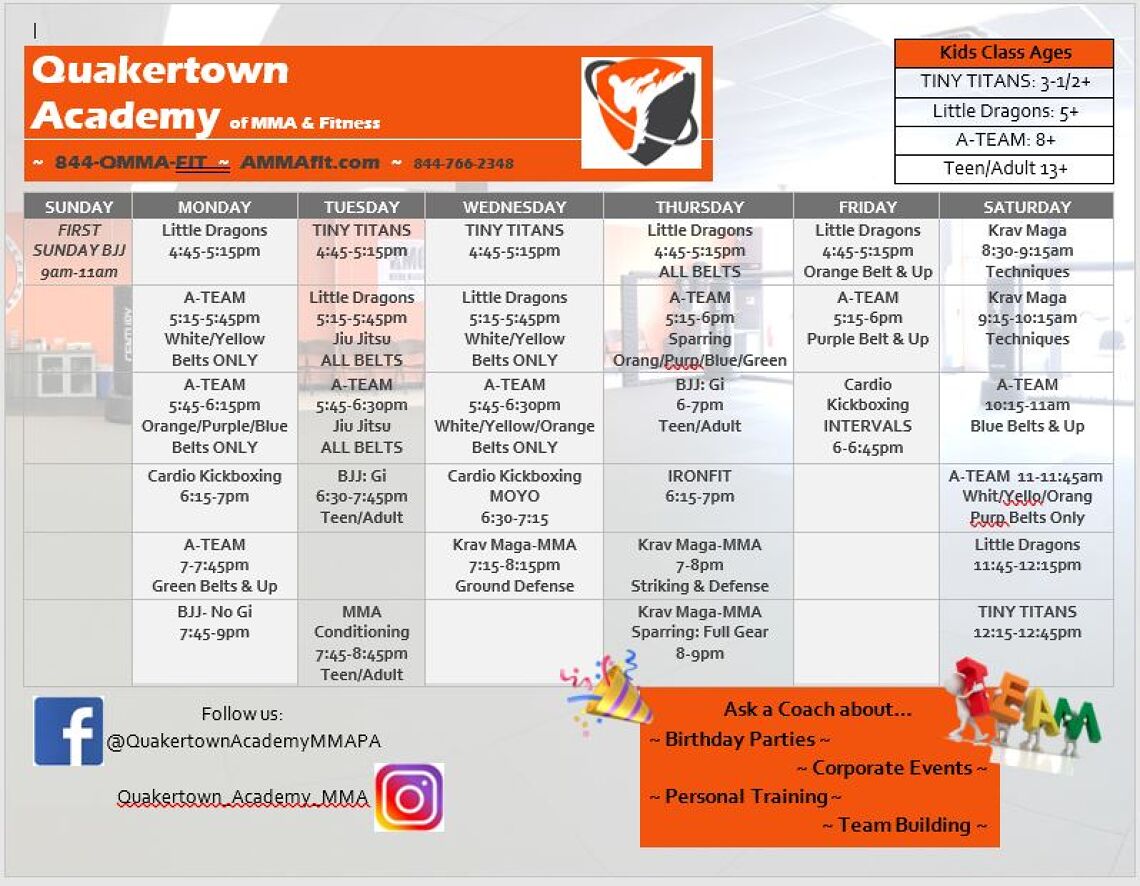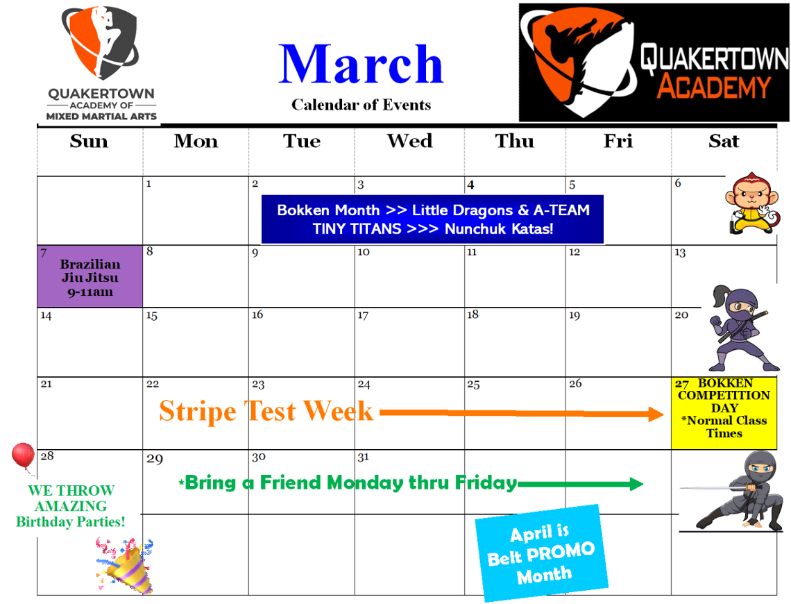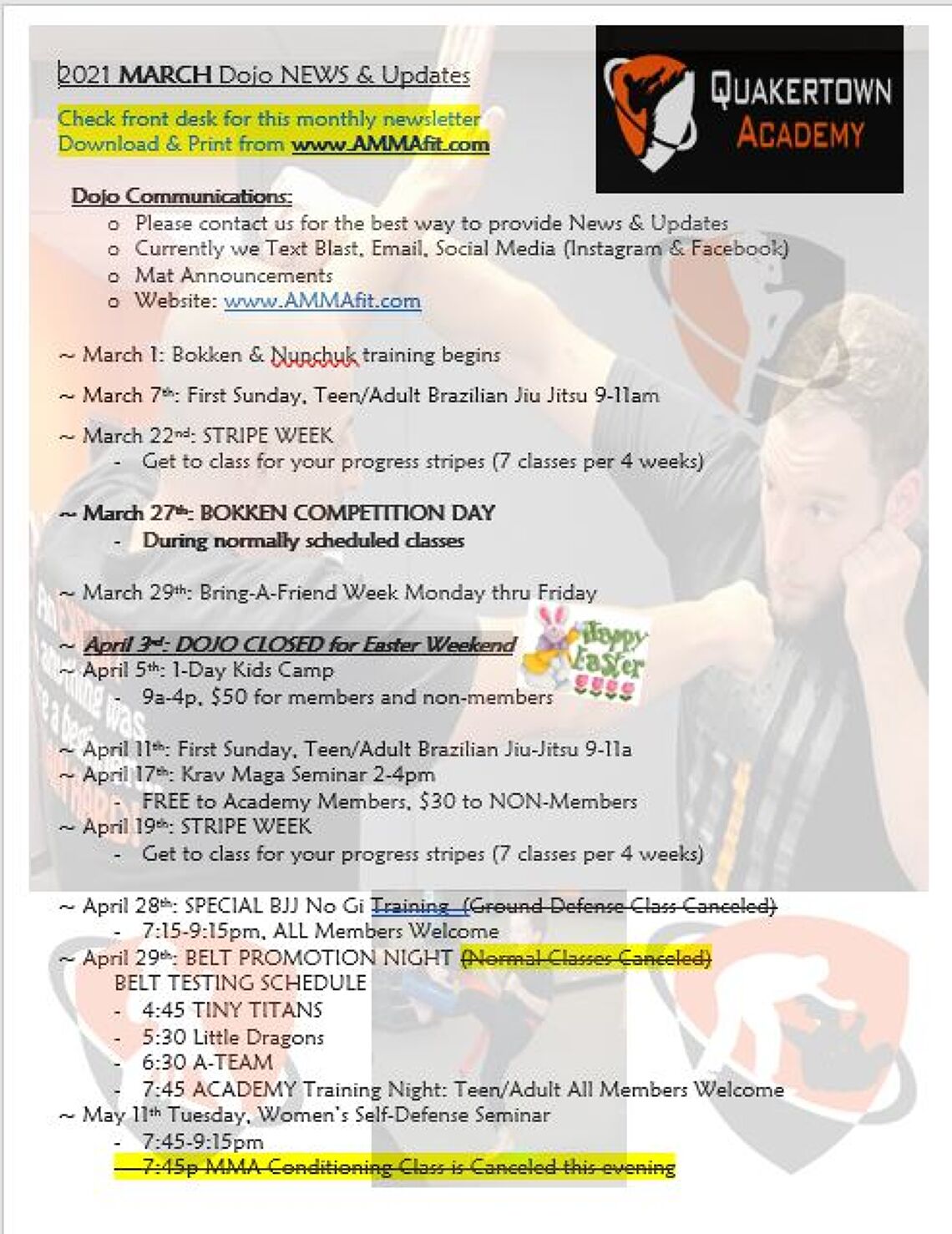 Hello Q-ACADEMY! The purpose of this email is to keep you up to date with Dojo activities throughout the upcoming weeks. We are also focusing on improving our communication, so please provide us with any feedback regarding how you receive Dojo News? [email protected] * Social Media: Facebook & Instagram * Mat Announcements from Instructors * Text Blasts * Mass emails * In Dojo signs ~ We have brought back our In-House NEWSLETTER - Attached below & at the front desk of the dojo UPCOMING DATES: Check front desk for this monthly newsletter Download & Print from www.AMMAfit.com ~ March 22nd: STRIPE WEEK - Get to class for your progress stripes (7 classes per 4 weeks) ~ March 27th: BOKKEN COMPETITION DAY - During normally scheduled classes ~ March 29th: Bring-A-Friend Week Monday thru Saturday ~ April 3rd: DOJO CLOSED for Easter Weekend ~ April 11th: First Sunday, Teen/Adult Brazilian Jiu-Jitsu 9-11am ~ April 19th: STRIPE WEEK - Get to class for your progress stripes (7 classes per 4 weeks) ~ April 28th: SPECIAL BJJ No Gi Training - 7:15-9:15pm, All Members Welcome - KRAV/MMA: Ground Defense Training Class Canceled ~ APRIL 29th: BELT PROMOTION NIGHT MODIFIED SCHEDULE >> - 4:45 TINY TITANS - 5:30 Little Dragons - 6:30 A-TEAM - 7:45 ACADEMY Training Night: All Members Welcome! ***7pm Krav Maga/MMA: Striking & Defense Class is canceled ~Academy Team