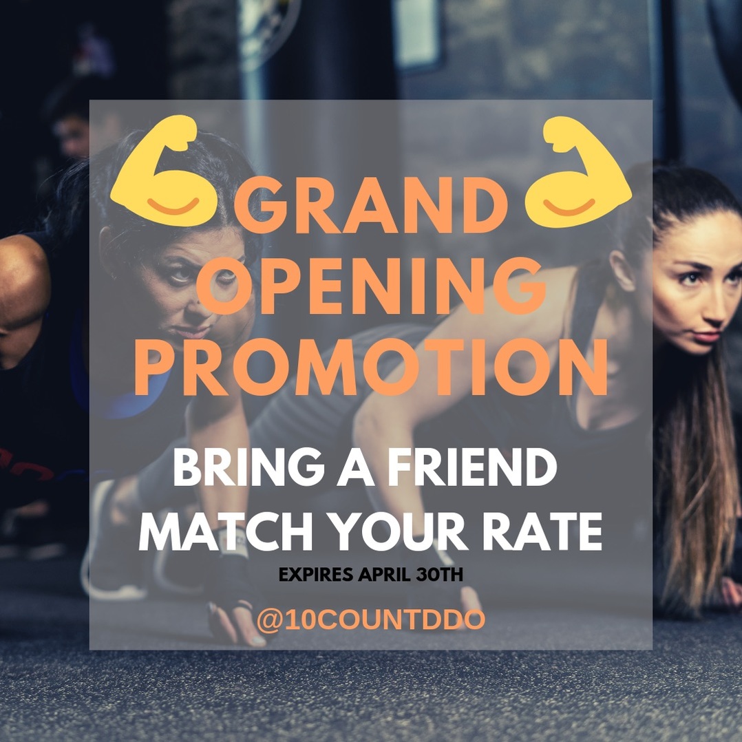 🌟Attention 10Count DDO Family! Now's your chance to convince your friends to come punch it out with you!🌟 (offer expires: April 30th) If you know someone who is looking for a great workout and who wants to hit the bags, now is their time to sign up with us! Bring a friend (or two) for a FREE workout. If they want to join, we will MATCH your lower rate to theirs! It's the perfect way to get your buddy to join you for a workout and to stay motivated. No more excuses 🥊💥 Click the button below to reserve your spot now. 🚶♀️🚶♀️ (Match your rate promotion: Expires April 30th) |