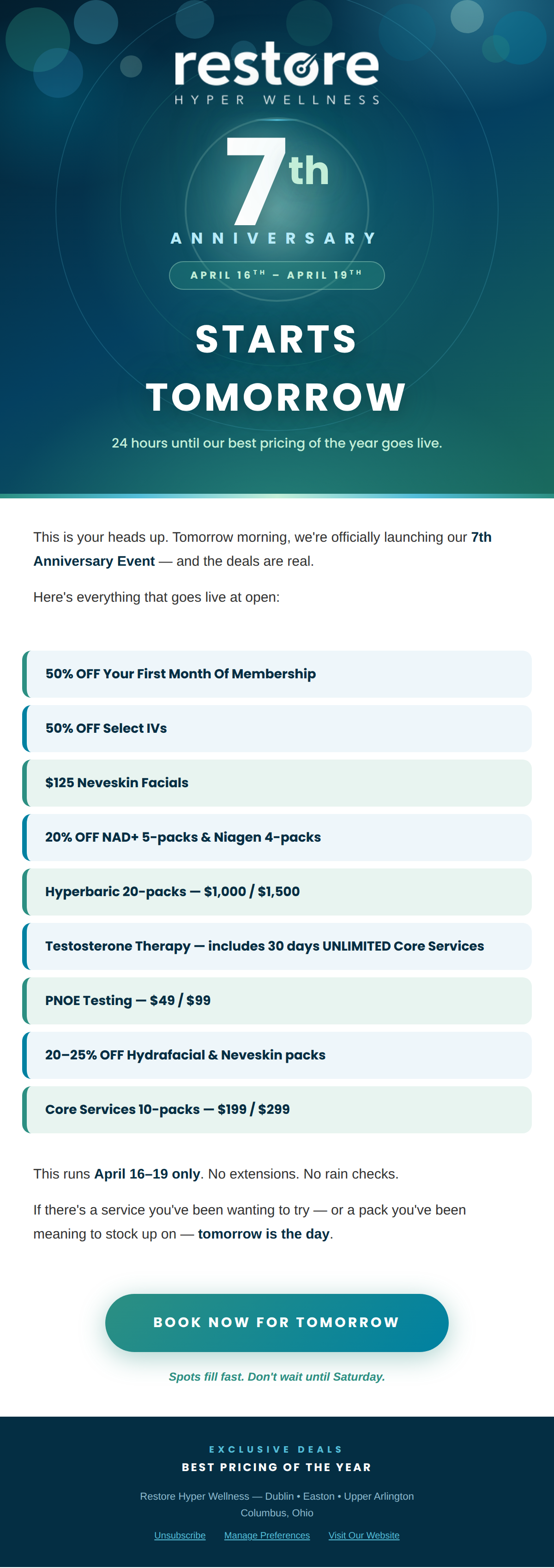 This email was sent to . If you do not wish to receive further emails from Restore Hyper Wellness - Dublin (6780 Longshore St D3, Dublin, OH 43017), please unsubscribe here.