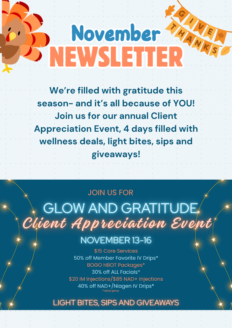 Join us for Glow and Gratitude a client appreciation event Nov 13-16! Weight Management program goes live this month!