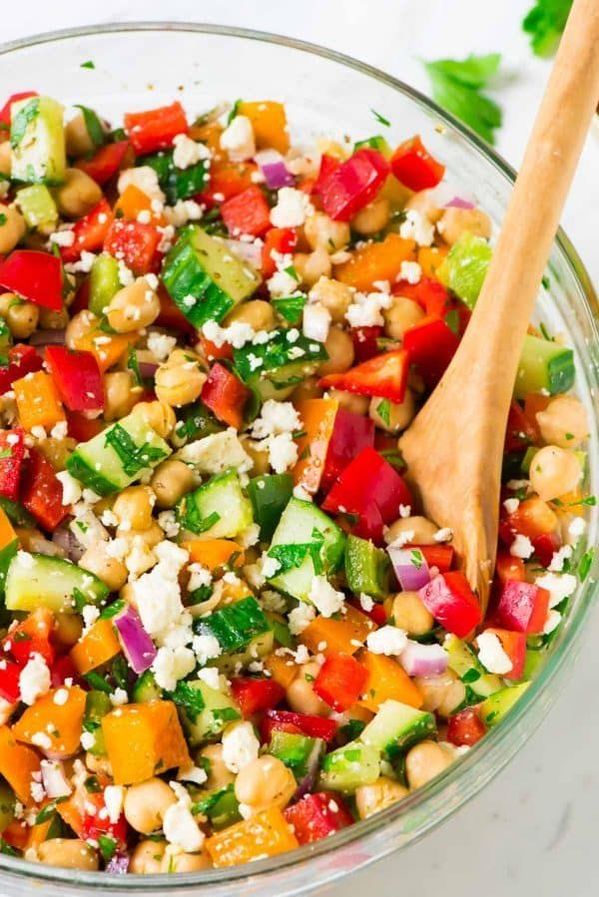 2 cans reduced-sodium chickpeas (15 oz cans, rinsed and drained) 1 1/2 cups chopped fresh flat-eaf parsley (about 1 bunch) 1 red bell pepper, diced 1 orange bell pepper, diced 1 green bell pepper, diced 1/2 large seedless cucumber, diced (about 2 cups) 1/2 cup crumbled feta cheese Dressing: 3 tablespoons extra-virgin olive oil 3 tablespoons red wine vinegar 2 cloves garlic, minced 1 1/2 teaspoons dried oregano 1 teaspoon kosher salt 1/2 teaspoon black pepper Instructions: Combine salad ingredients in a bowl. In a separate bowl, whisk together dressing ingredients. Add dressing to salad and refrigerate. Eat right away or let marinade for more flavor! |